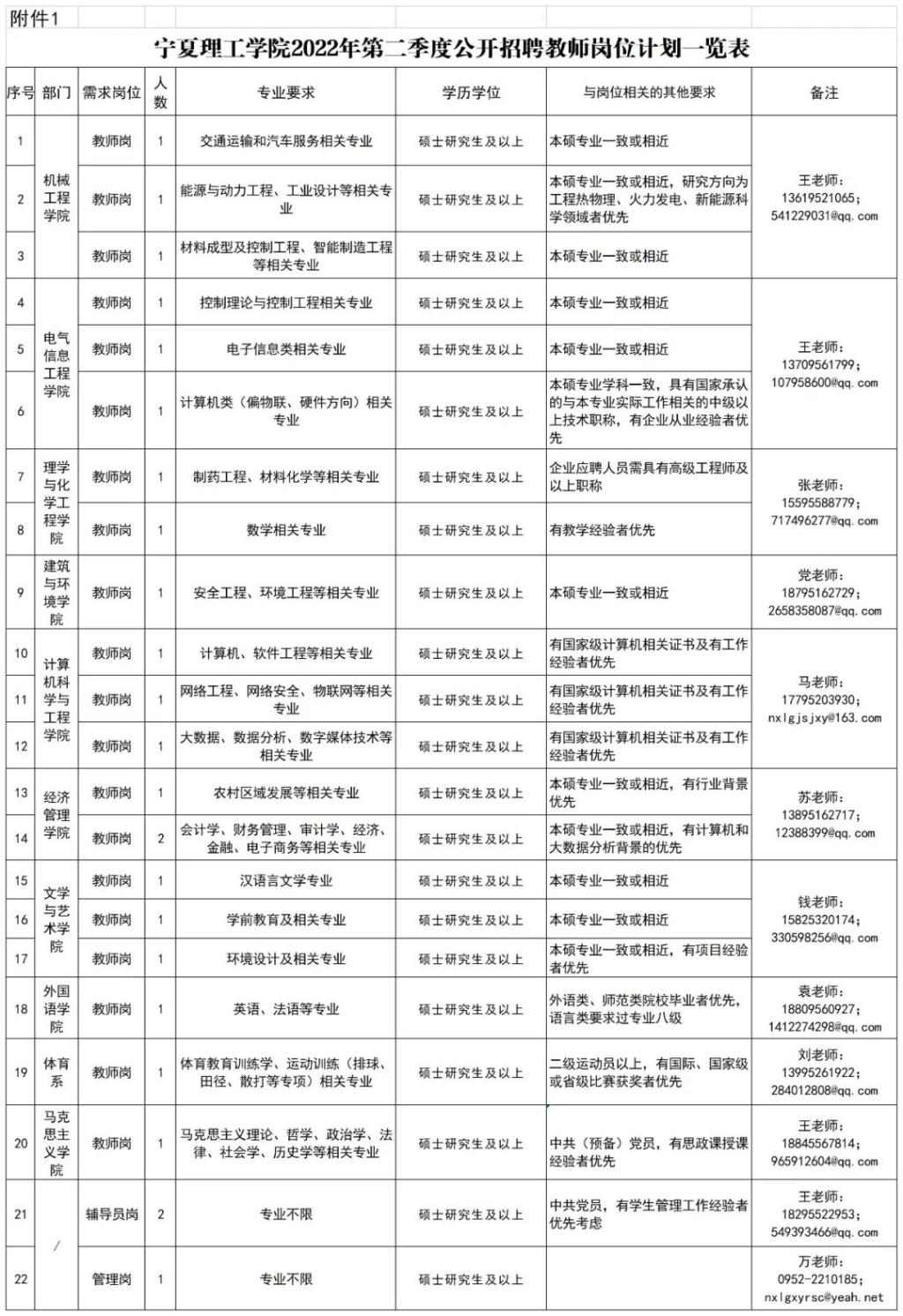 1.《宁夏理工欧洲杯2022年第二季度公开招聘教师岗位计划一览表》
